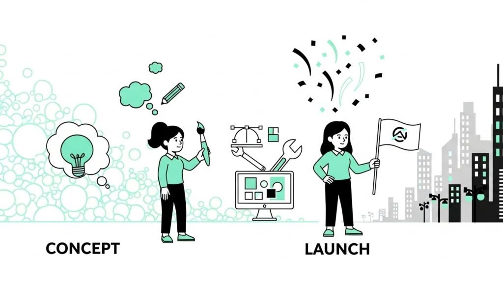 Dividimos o processo em fases estratégicas, garantindo que sua ideia seja validada, desenhada, construída e lançada com excelência.